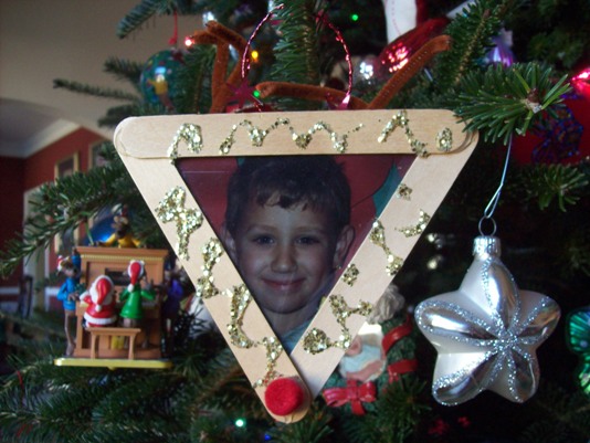 Our “Baby’s First Christmas” ornaments, represent another evolution in my identity as well as Steve’s. From the points of their births, really from the moments of their conceptions, we were Kevin and Brian’s mom and dad. That is who we are until the ends of our lives. Those ornaments form the foundation for all of those that have joined the collection because ‘my heart walks forever outside my body,’ and some of my favorites are the ones they made and brought home with such pride and enthusiasm. I love them, every one, from the early cardboard Christmas trees with sequins to the fur capped Grinch made from a painted light bulb. I particularly cherish those with their pictures, from days when they were toe-headed and missing teeth, my precious, precious boys.