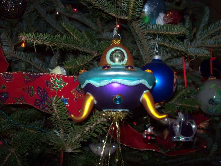 I have the first ornament my best friend, Cathy, gave me in high school: a sand dollar with holly painted on it. She remains my best girlfriend, and I now have a collection of treasures she has given me over the years. My particular favorites are the blown glass flying saucer, ballerina elephant and space shuttle. Where does she find them? It’s a gift.