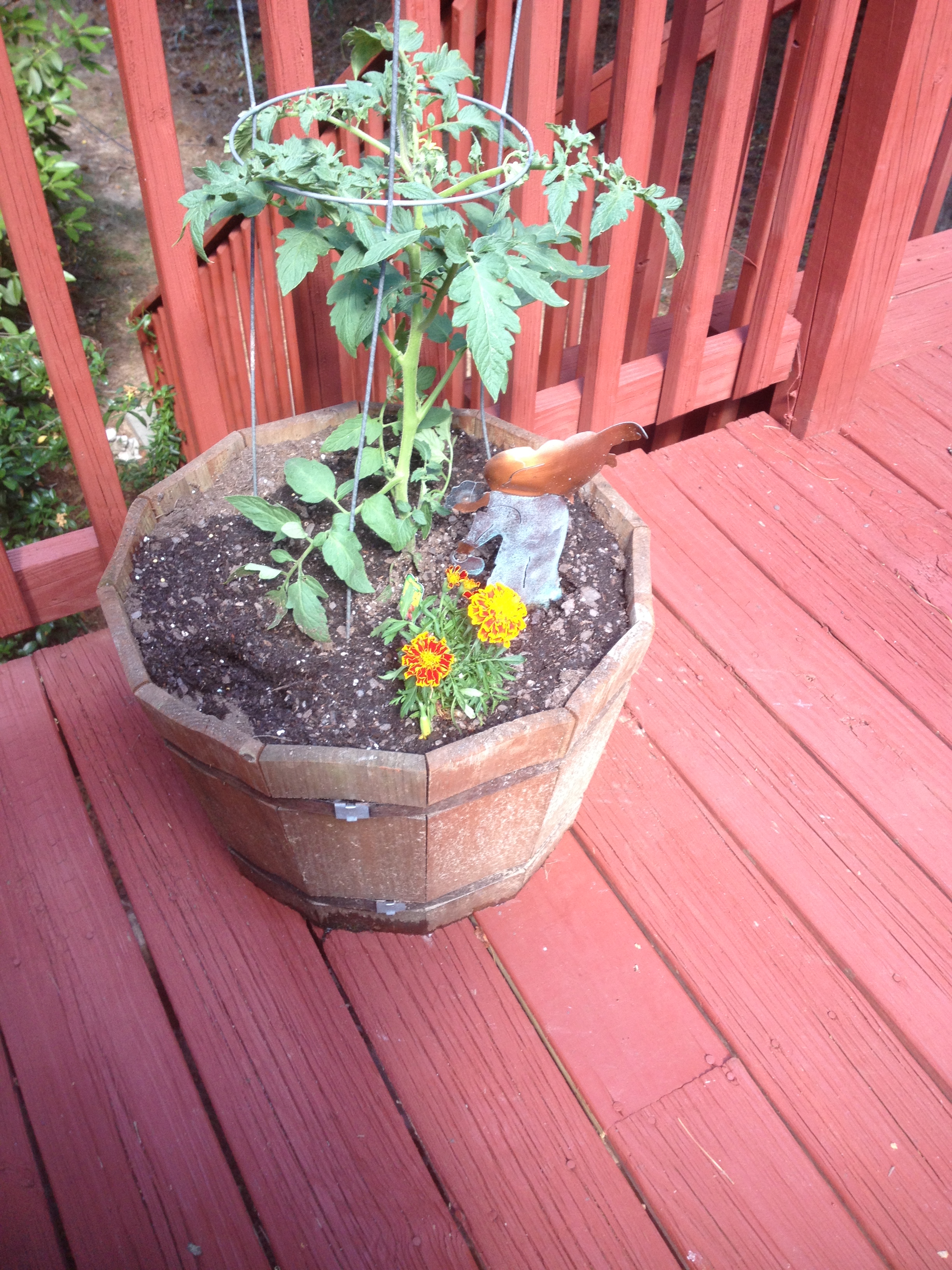 Finally I always plant a few marigolds around the bases of the other plants. My mom loved marigolds and planted them every year on our patio in the house where I grew up. I love the way they smell, and they are so cheerful and sunny.