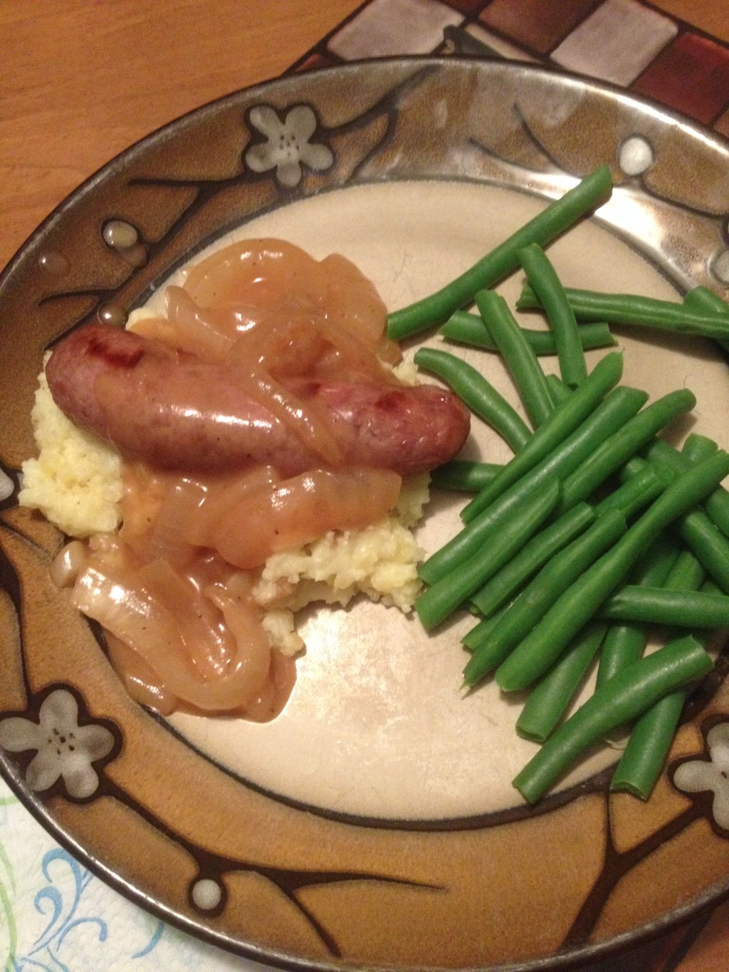 The choice du jour for Tuesday? Bangers and Mash. In the interest of full disclosure I have to say that I never ordered it any time we were in Britain, mostly because I didn’t realize what it is. Now, it will be tops on my list every time I cross the pond. We just finished dinner, and holy cow, it was outstanding. It’s easy too, although it uses a lot of pans. Here is my take on Bangers and Mash: